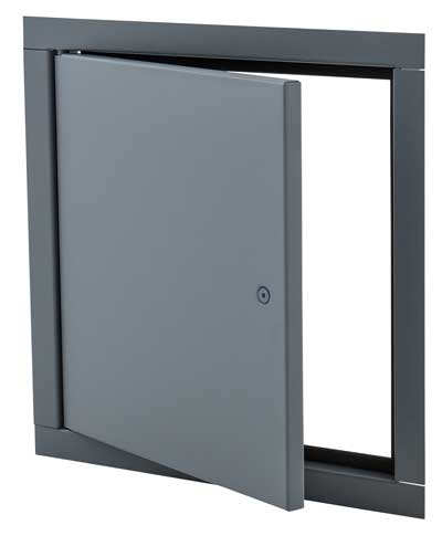 Provide Elmdor® SMD Series, Medium Security Access Doors (Specify model number and options). Access door and frame shall be fabricated from 12 guage, galvannealed steel with a prime coat gray finish. The door shall have rounded safety corners and a concealed pivoting rod hinge. Frame shall be one piece construction with no mitres or welds on the face. Latch shall be allen head with security pin operated. Finish shall be a prime coat gray.