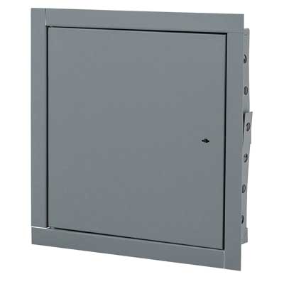 Access door frame shall be fabricated from 16 gage galvannealed steel with a prime coat finish and provided with masonry anchors and bolt holes. Access door panel shall be fabricated from 20 gage, galvannealed steel with a prime coat finish. Door shall be filled with 2 inch thick, fire rated insulation, and be welded pan type. Access door shall have spring automatic closer, be self-latching and contain interior latch release. Exterior latching shall be recessed and universal self-latching bolt, operated by either a knurled knob or flush key. Finish shall be a prime coat suitable for painting. Underwriters Laboratories classification shall be: Classified access frame and fire door assembly 1.5 hours, B-Label. Meets ANSI-UL 10B standard, and by Warnock-Hersey for 3 hours in ceilings. For wall installation, the door is Warnock-Hersey rated for 2 hours and CAN/ULC S104 for 2 hours.