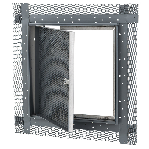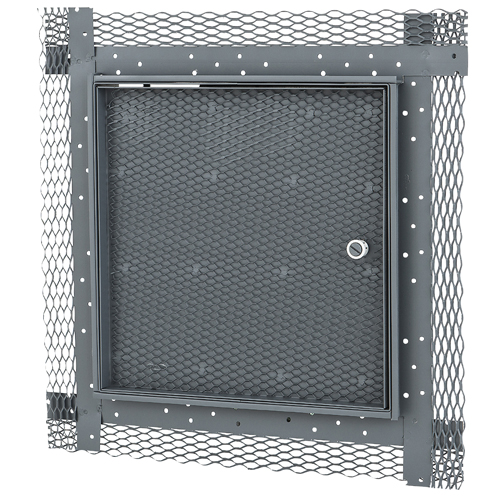 The door shall be recessed 5/8" and be lined with metal lath. The frame shall have a 3" wide metal lath on all four sides. Hinge shall be concealed type. Latch shall be screwdriver operated. Finish
