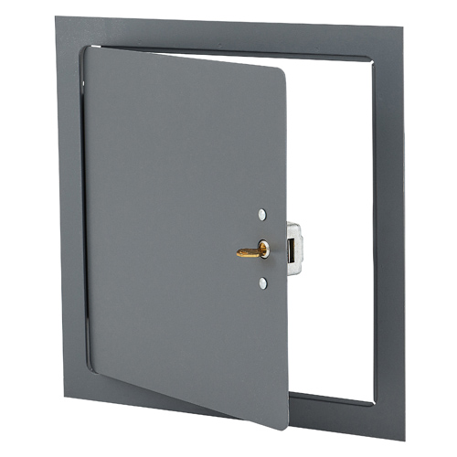 Access door and Frame shall be fabricated from 14 gage, galvannealed steel with a prime coat finish suitable for painting. Door shall have a 16 gage vertical reinforcement channel, a concealed hinge, and an automatic locking, springbolt lock.