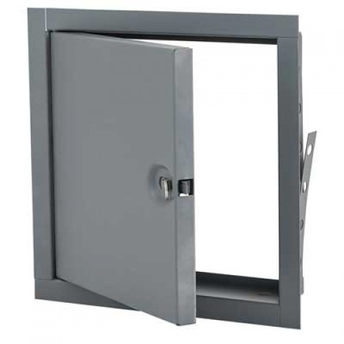 Access door and frame shall be fabricated from 16 gage, galvannealed steel with a prime coat finish suitable for painting. Hinge shall be concealed type. Door shall have a heavy duty spring to provide positive latching when closed, and an interior latch release slide enabling door to be opened from the inside. Exterior latch shall be recessed and operated using ring attached to the sliding bolt.