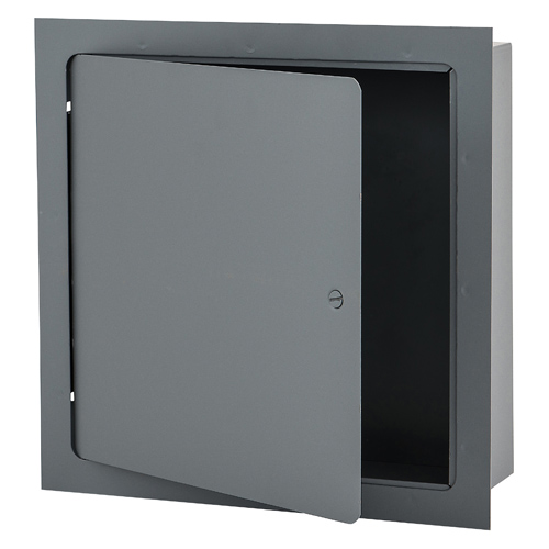 Provide Elmdor VB series, Valve Box (specify model number and options). Access door and frame shall be fabricated from 16 gage, galvannealed steel with a prime coat finish. The door shall have rounded safety corners and a concealed continuous piano hinge. Frame shall be one piece construction with no mitres or welds on the face. Latch shall be screwdriver operated. Elmdor Valve Box shall be fully enclosed with 16 gage, galvannealed steel with a prime coat finish. Finish shall be a prime coat suitable for painting.